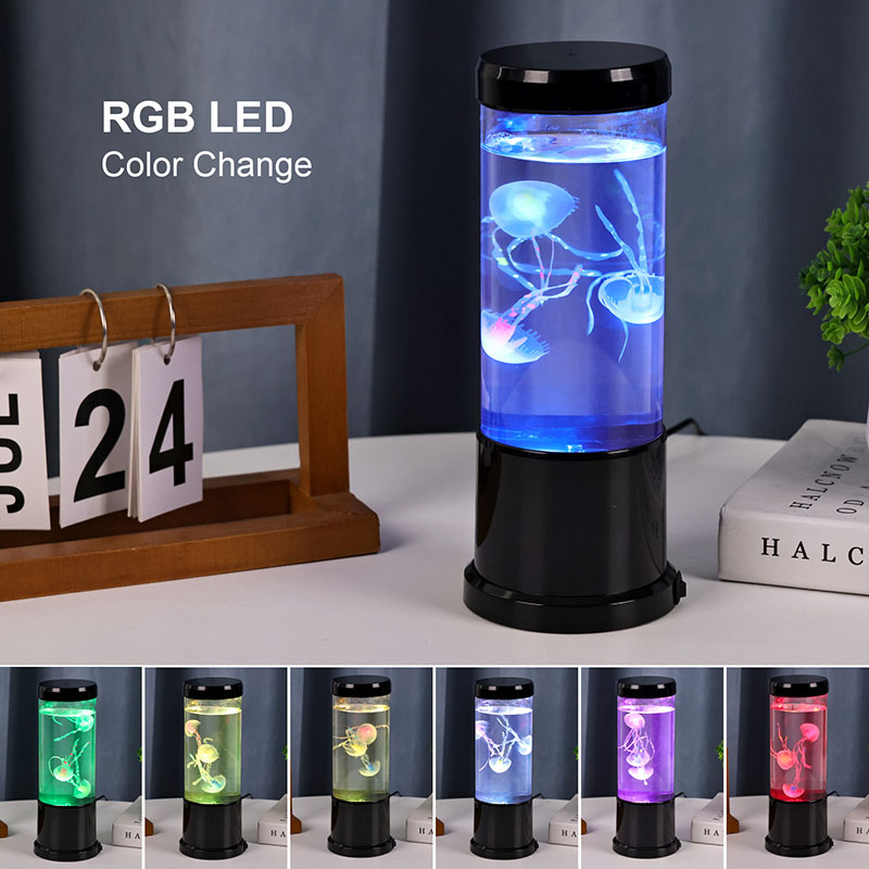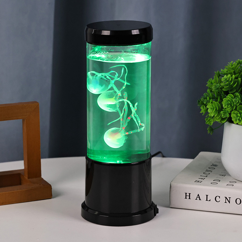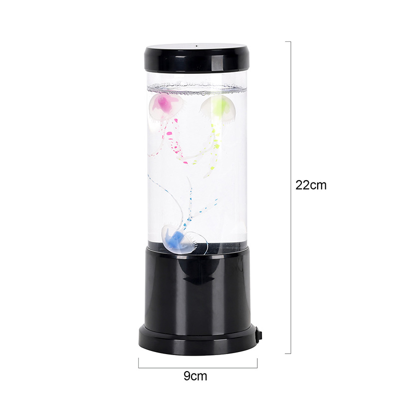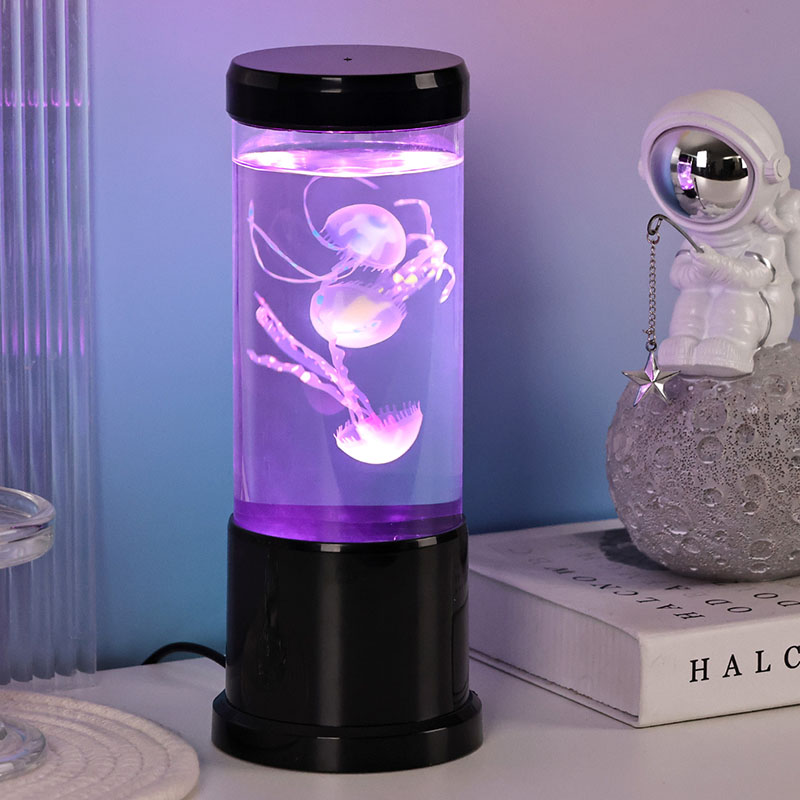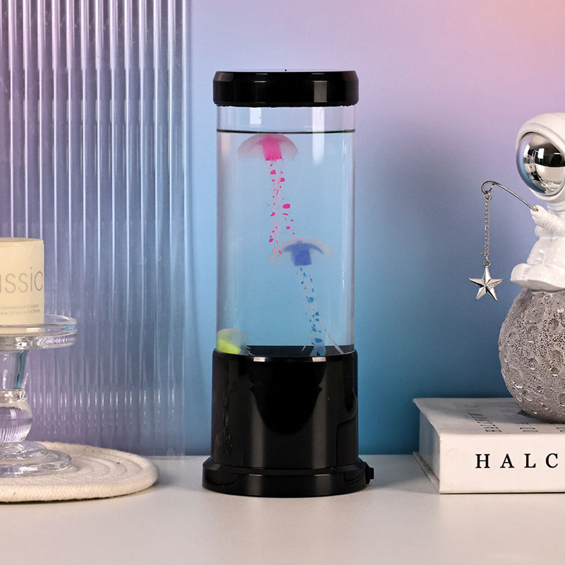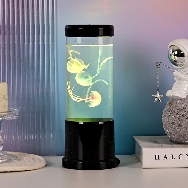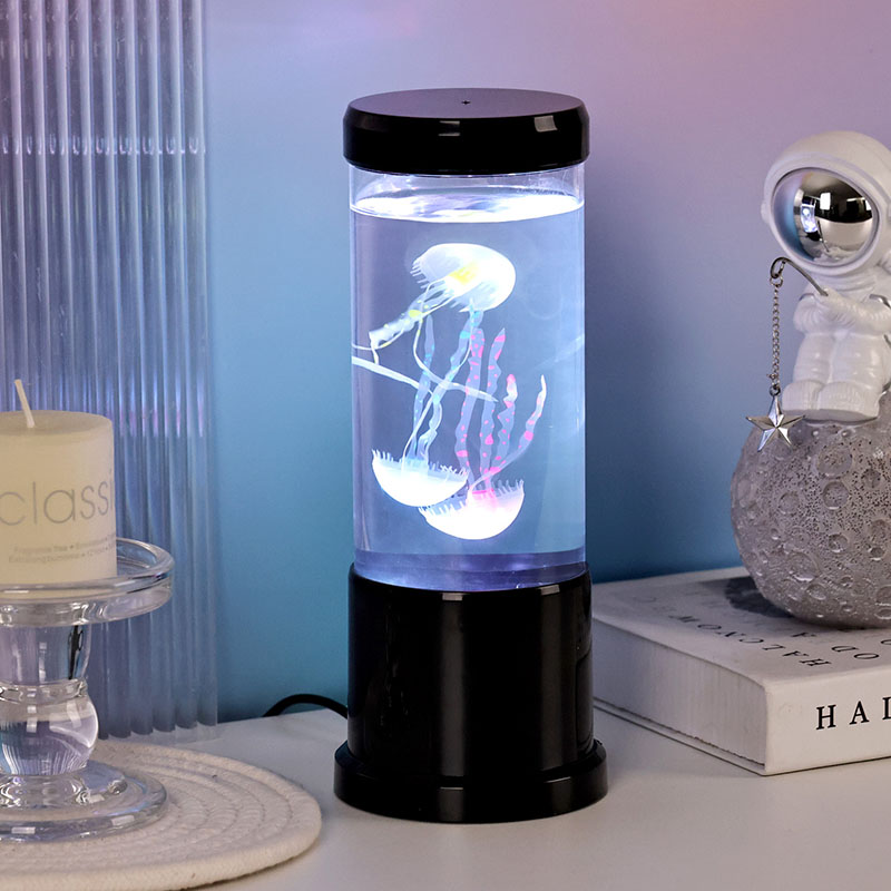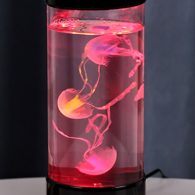 Valaisimessa on todenmukaisia mustavarjoisia meduusoja, jotka kelluvat hellästi kirkkaassa lieriömäisessä säiliössä luoden rauhoittavan vedenalaisen tunnelman, joka muuttaa minkä tahansa huoneen rauhalliseksi valtamereksi.