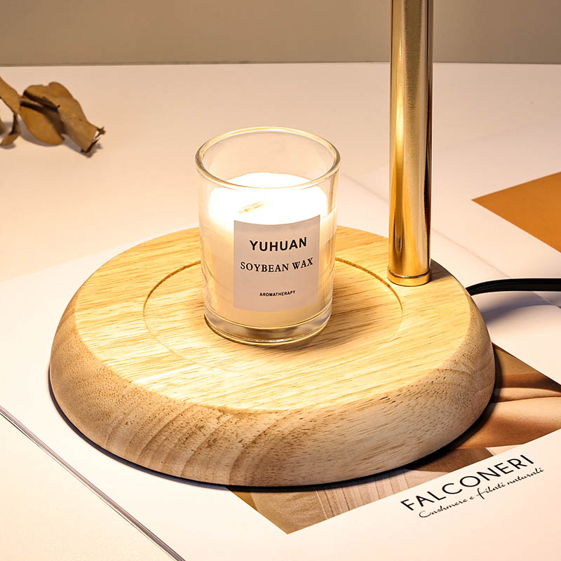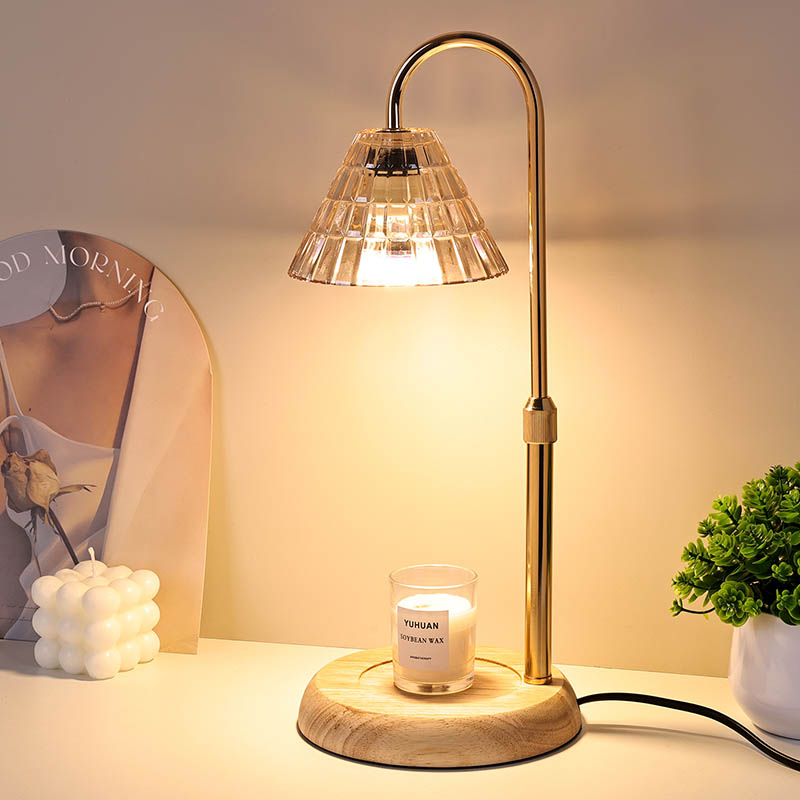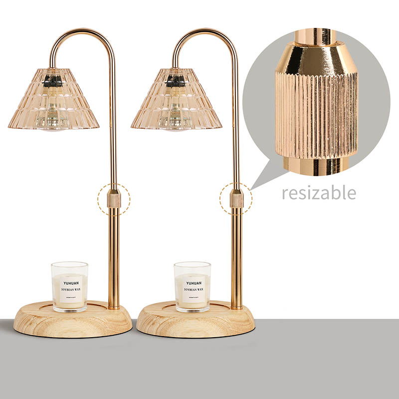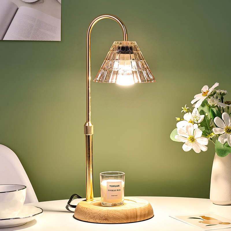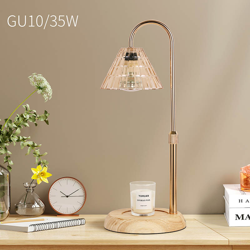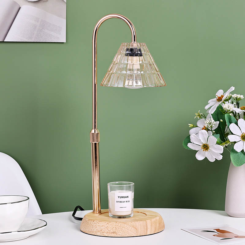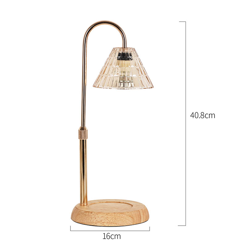 Lasivarjostin pöytävalaisin säädettävällä korkeudella on perinteinen design-tyyli, joka koostuu perinteisestä puujalustaisesta hehkulampusta ja kultaisesta metallista valaisinpylväästä.