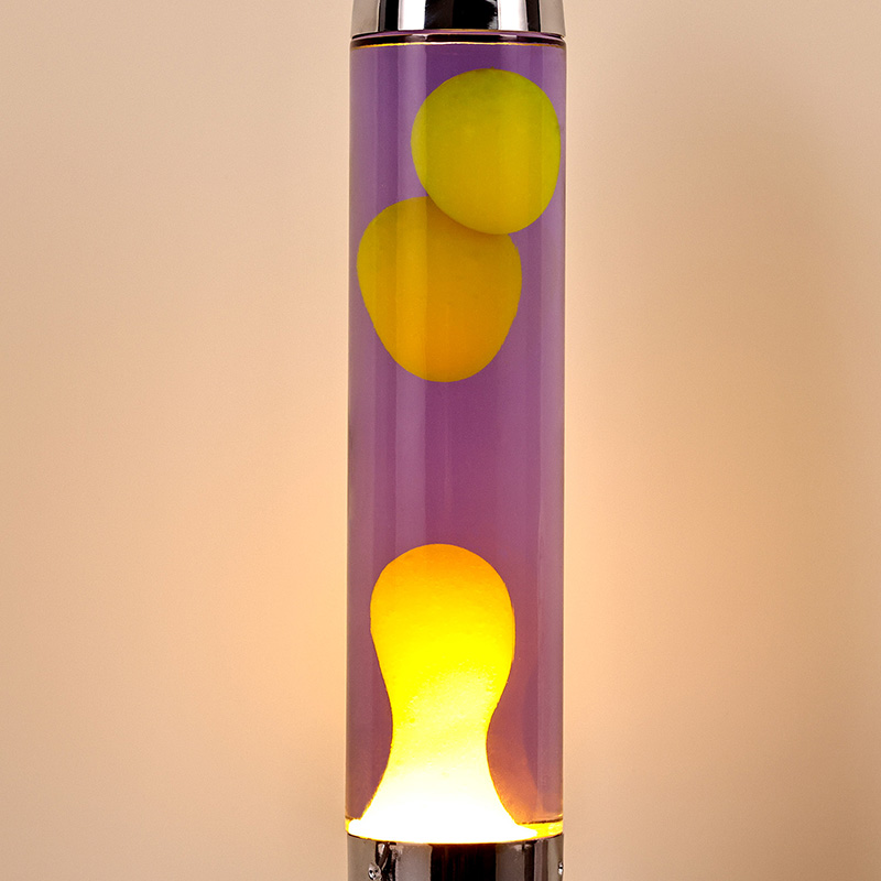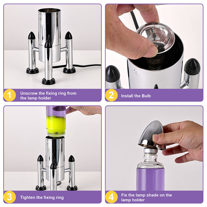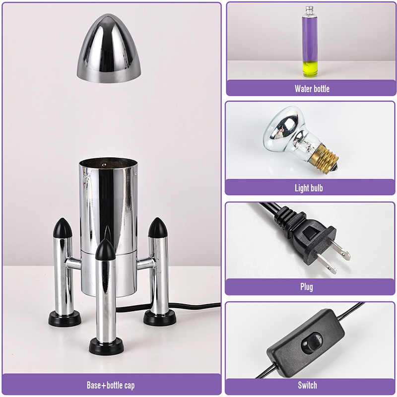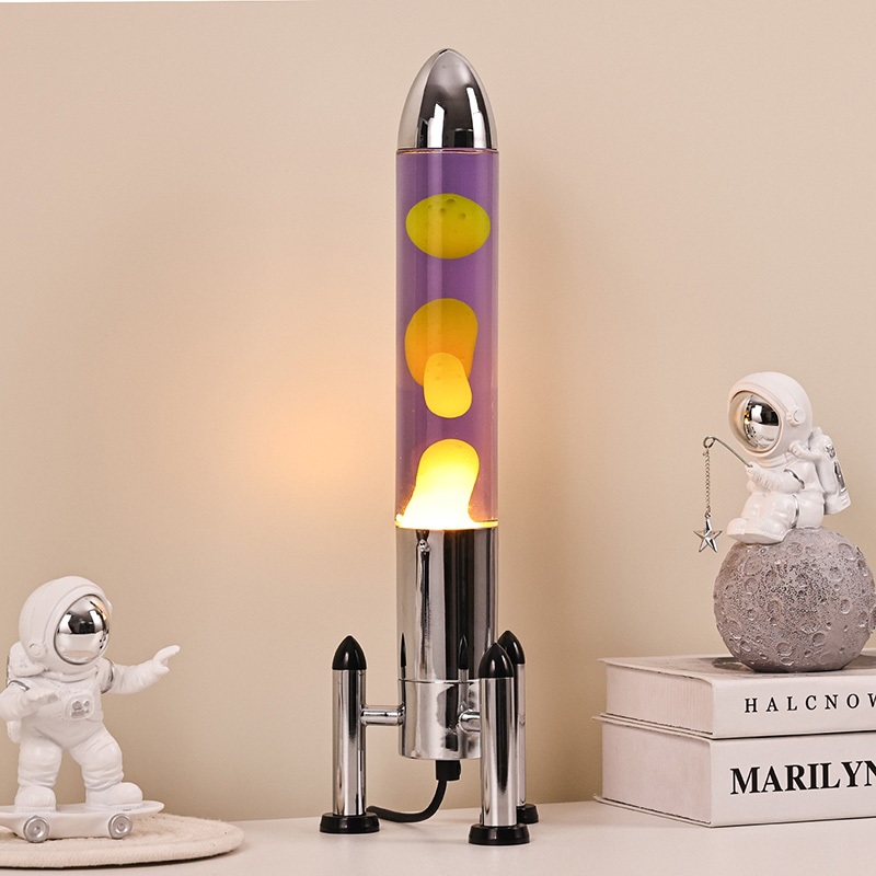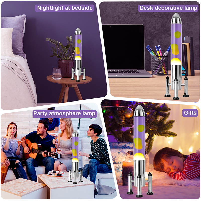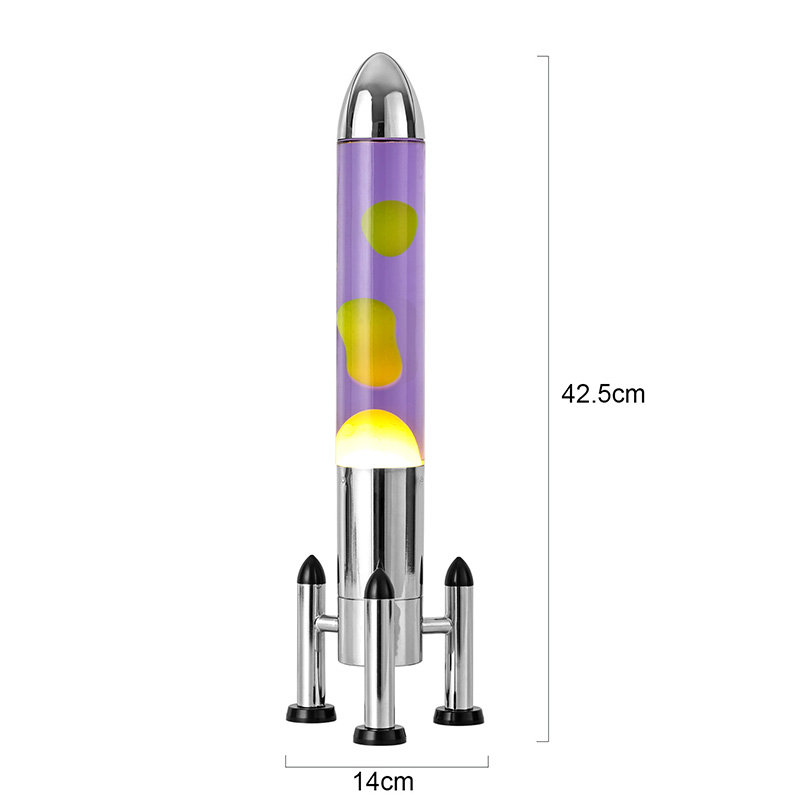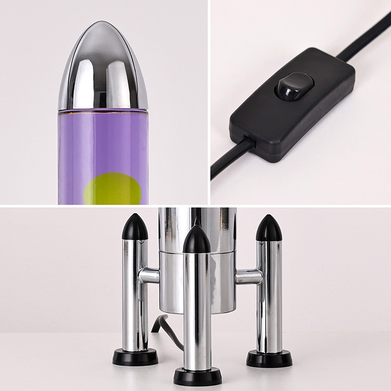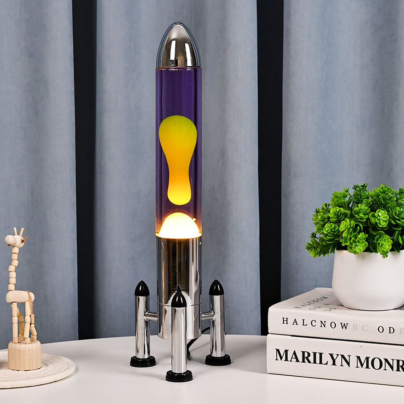 24VSuuri LED Lava -lamppu rakettivarjostimella on klassinen raketin muotoinen muotoilu, hopeanvärinen metallikuori ja läpinäkyvä lasipullorunko, yksinkertainen mutta tyylikäs. Keltainen kelluu sisällä olevan violetin nesteen sisällä
