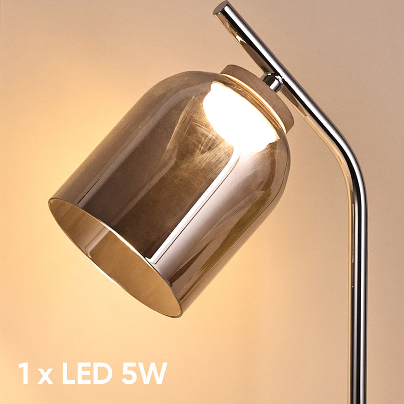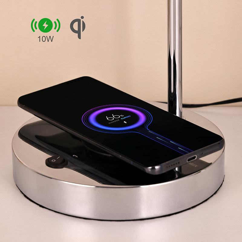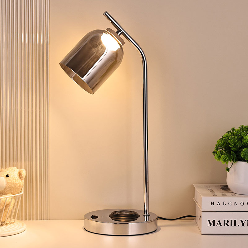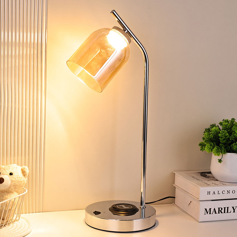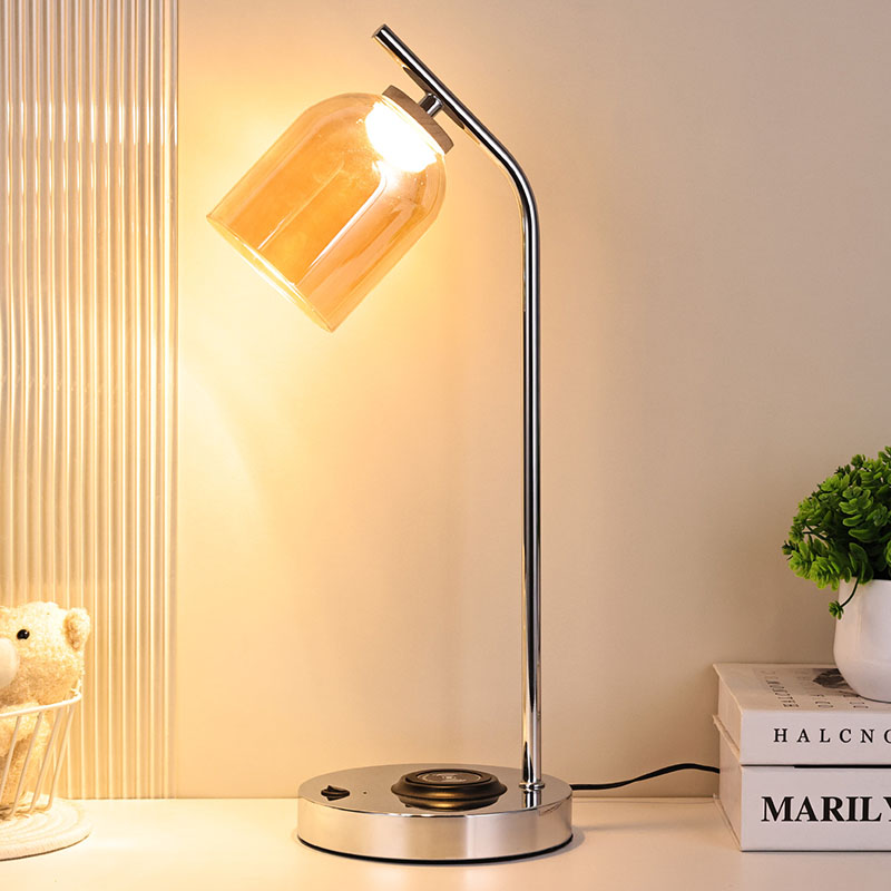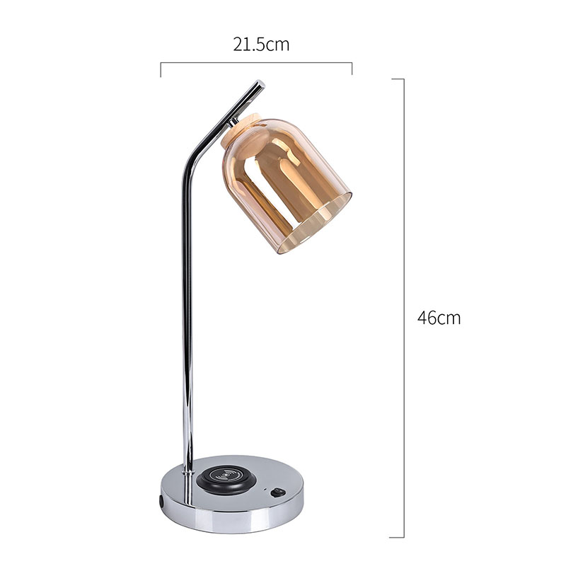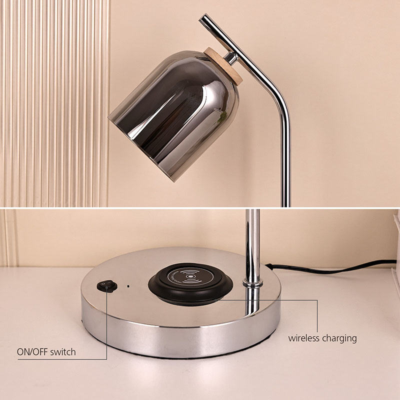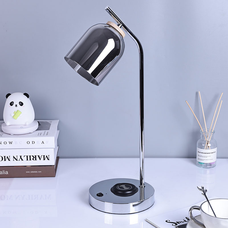 QI led-pöytävalaisin lasivarjostimella, metallisilla pohjalla ja rungolla