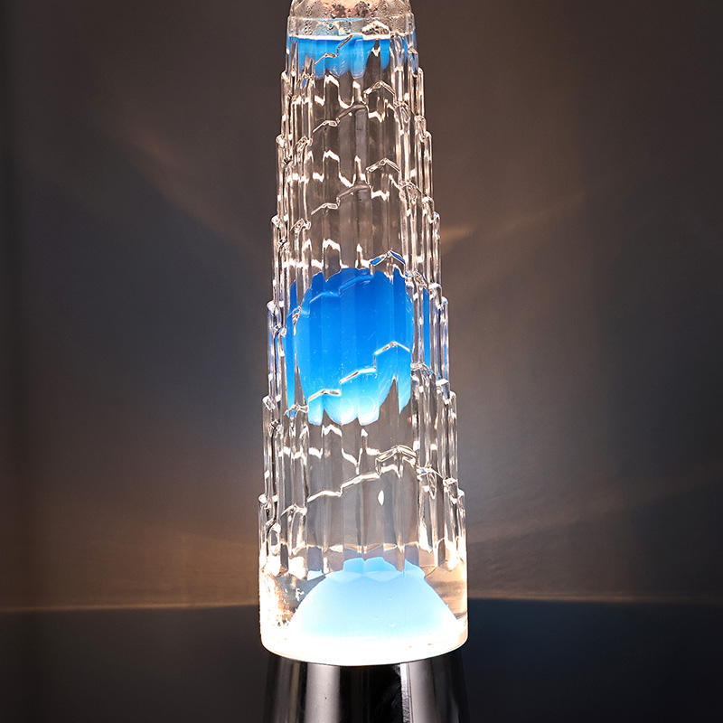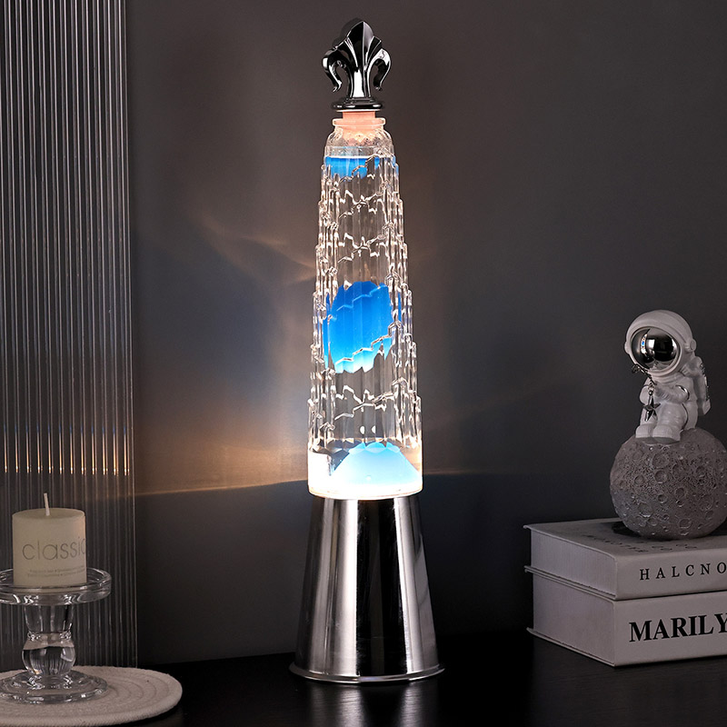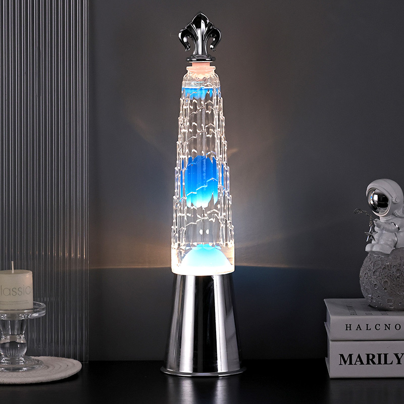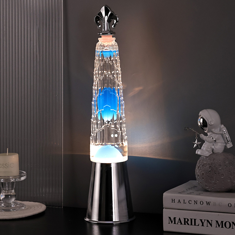 Tornivarjostin laavalampun pöytävalaisimessa on klassinen tornin muotoinen muotoilu, jonka yläosaan on upotettu upeita mustametallikoristeita, yksinkertainen mutta jalo. Läpinäkyvän lasipullon sisällä on sinistä vahaa